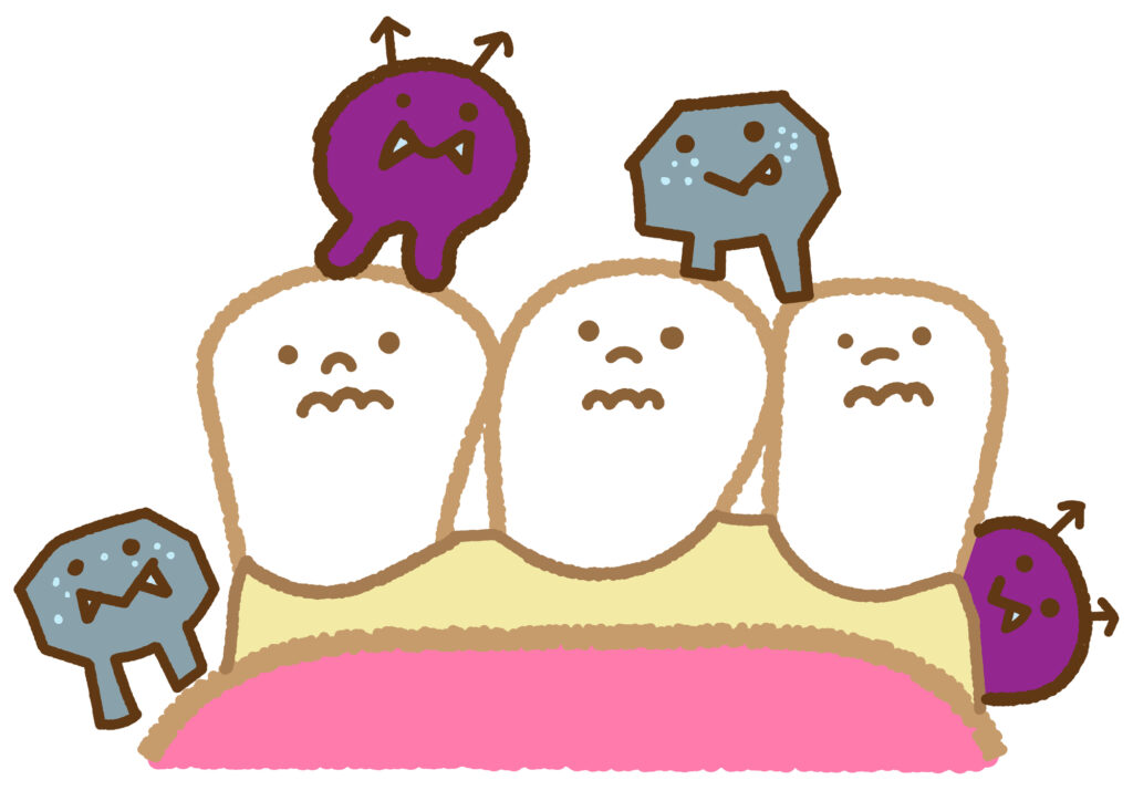歯垢は、歯の表面に付着する白っぽいネバネバとした汚れで、細菌のかたまりです。食後にしっかり歯磨きをしないとすぐにたまってしまい、虫歯や歯周病の原因となります。